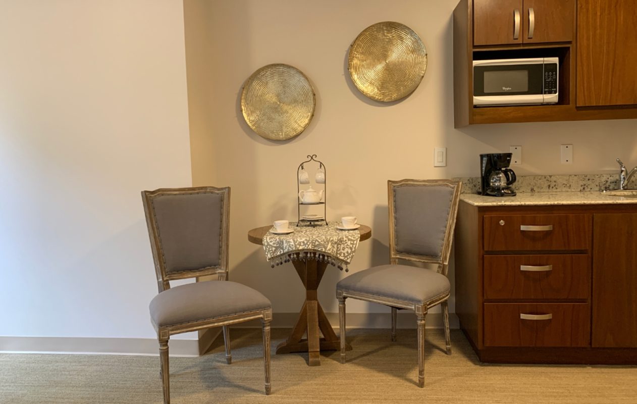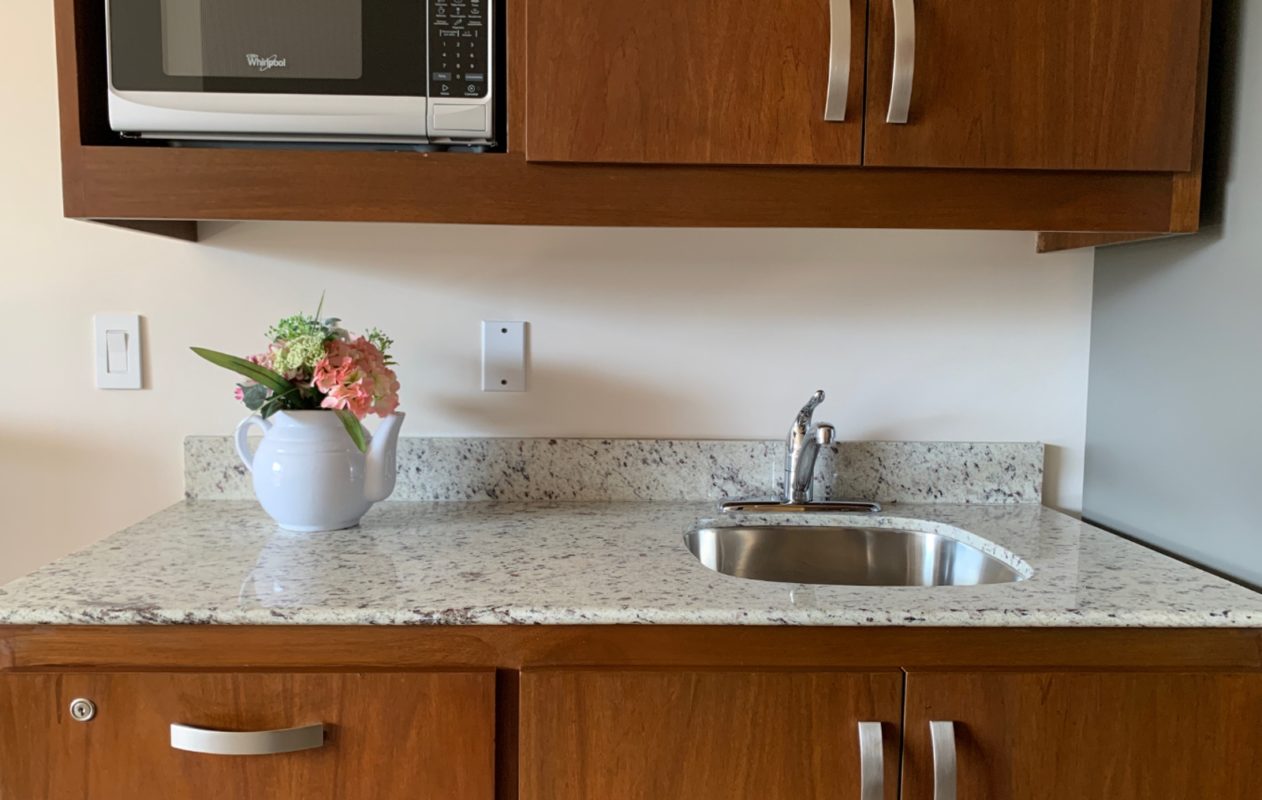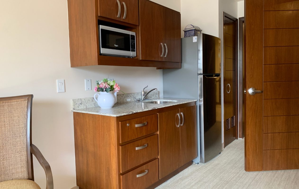 * Cocineta con tarja, alacenas, refrigerador de 11 pies y microondas en Assisted Living.